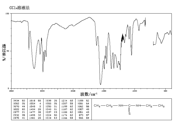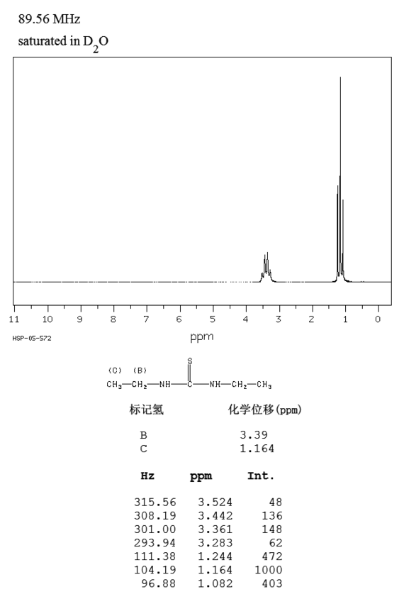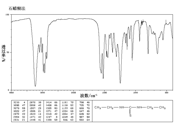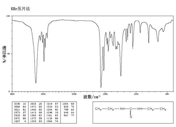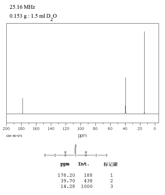 1.由乙胺与二硫化碳反应而得。首先将乙胺加入反应釜,在搅拌下加热升温至35~40℃,再一边搅拌一边滴加二硫化碳,在40~45min内滴加完毕。然后加热升温至95℃,保持反应3h。然后降温至50℃出料。产物经冷却、过滤、水洗、干燥,即得成品。产品含量92%,收率80%。