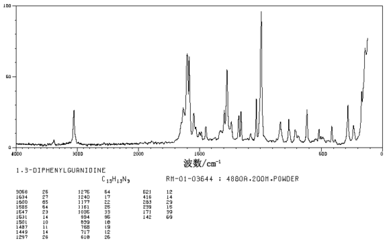 2.首先把所需量的乙醇和水加入耐压反应釜,室温下通氨1h,使溶液中的氨达到饱和,然后边搅拌边加入二苯基硫脲,完毕,再通氨15min。将氧化锌调成稀糊状,慢慢滴加至反应釜中,滴加时间1h左右,最后将反应釜密封,通氨升压到所需值,在38~40℃反应3h,继续升温到一定温度再反应一定时间。反应完毕,释压、放料、过滤、醇洗。将滤液和洗液合并精馏,以回收部分乙醇。由于二苯胍仅微溶于水,随着精馏的进行,釜底析出粗二苯胍的量越来越多,待乙醇基本蒸出后停止。然后往其中加入少量水,在不断搅拌下滴加1∶1的盐酸,使二苯胍生成可溶性的二苯胍盐酸盐,待溶液pH值为2~3时,停止滴加盐酸,将其过滤除去副产物和杂质,滤液再用10%的NaOH中和,此时即有精制的白色二苯胍沉淀析出。再过滤、水洗、干燥即产品。