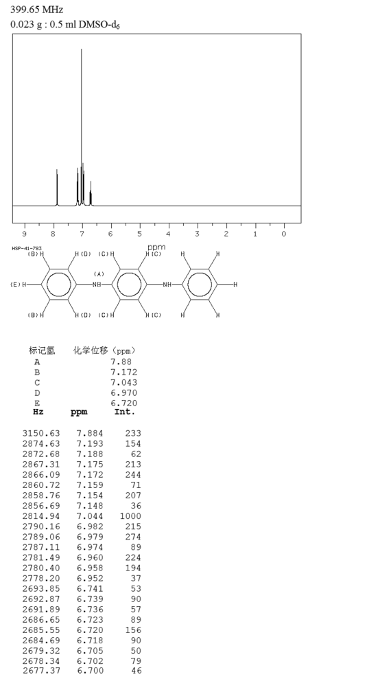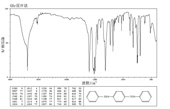 将对苯二酚与苯胺在磷酸三乙酯的催化下,于280~300℃和0.7MPa的压力下反应一定时间。反应结束后进行真空蒸馏。先在低真空下除去过量的苯胺,然后再在较高的真空下蒸出中间物。将蒸完中间物的剩余物料进行切片、打粉、包装即为成品。合成反应如下