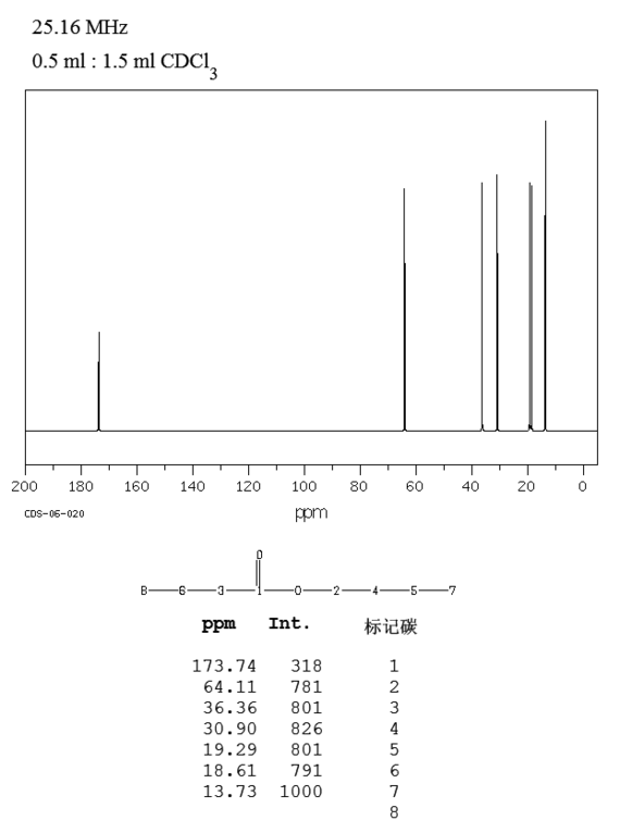 于装有搅拌器、回流冷凝器的反应瓶中,加入正丁醛(2)50mL,含2.5g异丙醇铝的四氯化碳溶液5.0mL,反应放热,温度迅速上升至沸腾。反应结束后,依次用稀盐酸。水洗涤,无水硫酸镁干燥,分馏,收集164~166℃的馏分,得化合物(1)①,收率60%。注:①若反应控制在20℃以下进行,丁酸丁酯的收率可达94%。当用叔丁醇铝作催化剂并低温反应时,收率为90%。[21]
