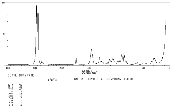 1.由丁酸与丁醇酯化而得。将丁酸、丁醇及少量硫酸加入反应锅,加热回流脱水约4-5h,再经碱液中和、洗涤,减压分馏,收集112℃(14.6kPa)馏分即得成品。