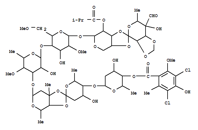| 英文名称: | b-D-Mannopyranoside,O-(1R)-6-deoxy-4-C-formyl-2,3-O-methylene-D-galactopyranosylidene-(1®3-4)-2-O-(2-methyl-1-oxopropyl)-a-L-lyxopyranosylO-2,6-dideoxy-4-O-(3,5-dichloro-4-hydroxy-2-methoxy-6-methylbenzoyl)-b-D-arabino-hexopyranosyl-(1®4)-O-2,6-dideoxy-D-arabino-hexopyranosylidene-(1®3-4)-O-2,6-dideoxy-3-C-methyl-b-D-arabino-hexopyranosyl-(1®3)-O-6-deoxy-4-O-methyl-b-D-galactopyranosyl-(1®4)-2,6-di-O-methyl- (9CI) |