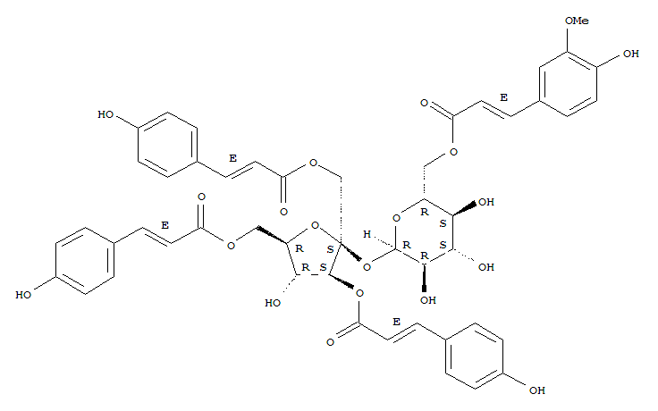 | 英文名称: | a-D-Glucopyranoside,1,3,6-tris-O-[(2E)-3-(4-hydroxyphenyl)-1-oxo-2-propen-1-yl]-b-D-fructofuranosyl,6-[(2E)-3-(4-hydroxy-3-methoxyphenyl)-2-propenoate] |