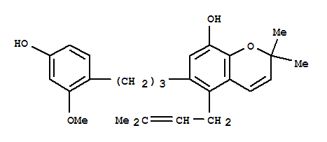 | 英文名称: | 2H-1-Benzopyran-8-ol,6-[3-(4-hydroxy-2-methoxyphenyl)propyl]-2,2-dimethyl-5-(3-methyl-2-buten-1-yl)- |