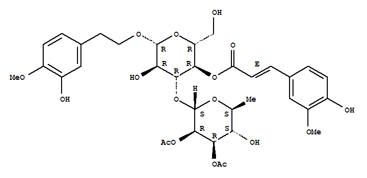 | 英文名称: | b-D-Glucopyranoside,2-(3-hydroxy-4-methoxyphenyl)ethyl 3-O-(2,3-di-O-acetyl-6-deoxy-a-L-mannopyranosyl)-,4-[(2E)-3-(4-hydroxy-3-methoxyphenyl)-2-propenoate] |