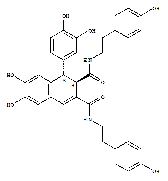 | 英文名称: | 2,3-Naphthalenedicarboxamide,1-(3,4-dihydroxyphenyl)-1,2-dihydro-6,7-dihydroxy-N2,N3-bis[2-(4-hydroxyphenyl)ethyl]-,(1R,2S)-rel- |