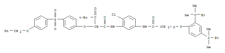 | 中文名称: | N-[5-[[4-[2,4-双(叔戊基)苯氧)]-1-氧代丁基]氨基]-2-氯苯基]-4,4-二甲基-3-氧代-2-[4-[[4-(苯甲氧基)苯基]磺基]苯氧基]戊酰胺 |