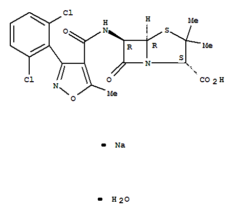 | 英文名称: | 4-Thia-1-azabicyclo[3.2.0]heptane-2-carboxylicacid,6-[[[3-(2,6-dichlorophenyl)-5-methyl-4-isoxazolyl]carbonyl]amino]-3,3-dimethyl-7-oxo-,sodium salt, hydrate (1:1:1), (2S,5R,6R)- |
