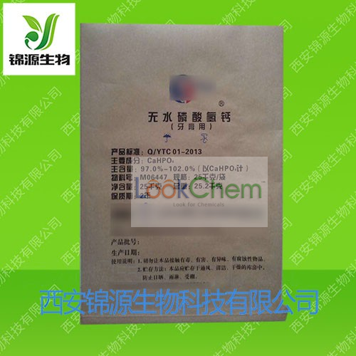 无水磷酸氢钙,化学名:磷酸二钙,英文名称:Calcium phosphate dibasic,分子式:CaHPO4,分子量:136.06,CAS:7757-93-9,外观为白色粉末、无臭无味,溶于稀盐酸、硝酸、醋酸,微溶于水(溶解度0.1 g/l,25°C),不溶于乙醇。表观密度0.9 g/cm3,在空气中稳定,在370 °C时分解。