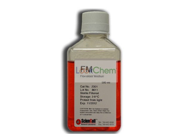 成纤维细胞培养基是专门为正常人类成纤维细胞体外培养设计的适于其生长的培养基。它是经灭菌的液体培养基,包含必需和非必需氨基酸、维生素、有机和无机化合物、激素、生长因子、微量矿物质和低浓度胎牛血清(2%)。该培养基缓冲体系为HEPES和重碳酸盐,在含5%CO2的细胞培养箱中平衡后pH值为7.4。该培养基的配方能够选择性的促进正常人类成纤维细胞体外培养中的增殖和生长,并为其达到理想营养平衡状态提供数量上和质量上的保证。