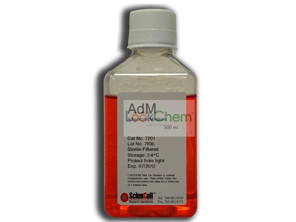 脂肪细胞培养基是专门为正常人类脂肪细胞体外培养设计的适于其生长的培养基。是经灭菌的液体培养基,包含所有培养脂肪细胞必需营养物质。该培养基缓冲体系为重碳酸盐,在含5%CO2的细胞培养箱中平衡后pH值为7.4。