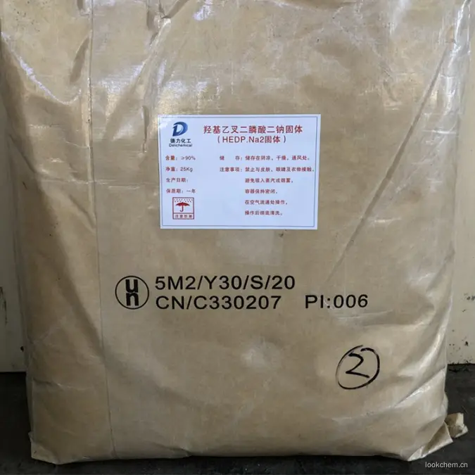 HEDP·Na2是一种有机磷酸类阻垢缓蚀剂,能与铁、铜、锌等多种金属离子形成稳定的络合物,能溶解金属表面的氧化物。HEDP·Na2在250℃下仍能起到良好的缓蚀阻垢作用,在高pH值下仍很稳定,不易水解,一般光热条件下不易分解。耐酸碱性、耐氯氧化性能较其它有机磷酸(盐)好。可与水中金属离子,尤其是钙离子形成六圆环螯合物,因而具较好的阻垢效果并具明显的溶限效应,当和其它水处理剂复合使用时,表现出理想的协同效应。