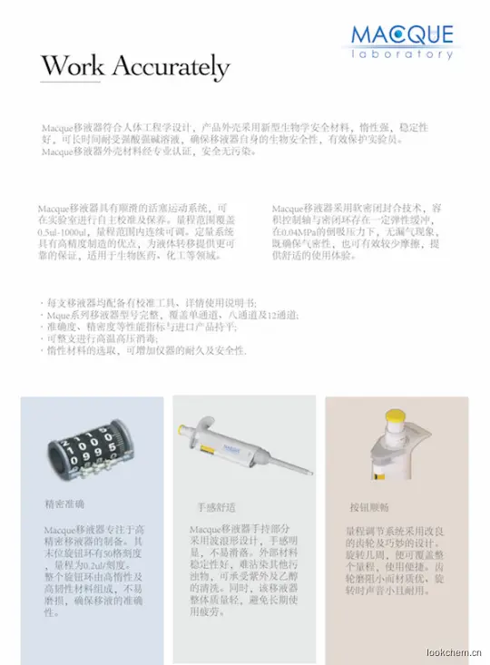 Mque11000移液器外壳采用新型生物学安全材料,惰性强,稳定性好,可整支消毒灭菌,可长时间耐受强酸强碱溶液,确保移液器自身的生物安全性,有效保护实验员。Mque系列移液器外壳材料经专业认证,安全无污染.
