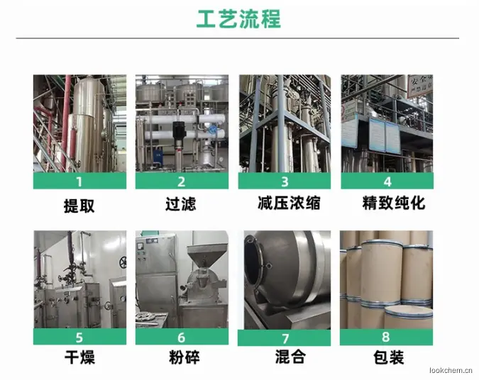 生产工艺:主要由醇提、萃取、层析、结晶等工序完成。
