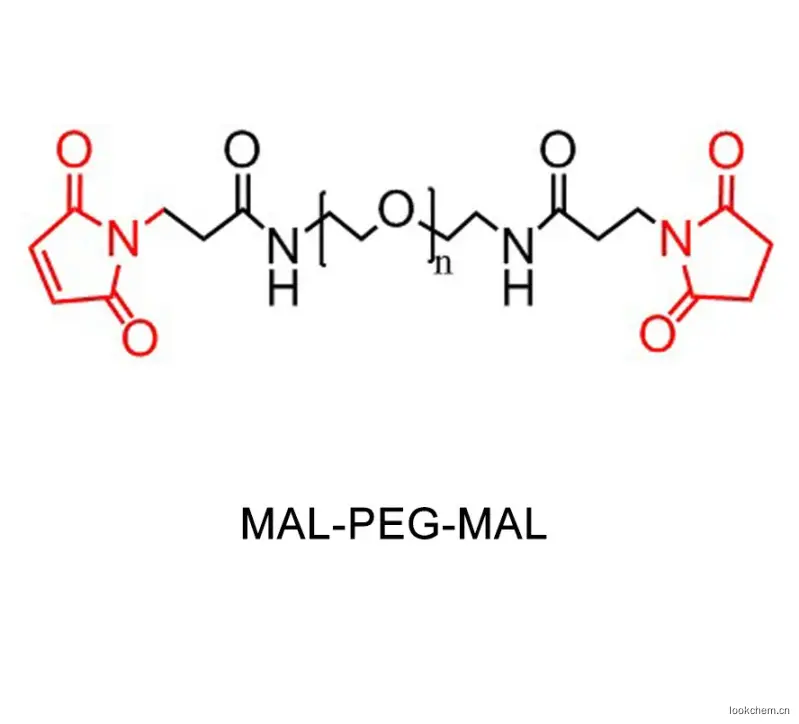 Mal-PEG-Mal 是一种双边活性PEG衍生物,可用于修饰蛋白质、多肽、颗粒等材料。马来酰亚胺与巯基在PH6.5-7.5条件下生成硫醚键。聚乙二醇修饰的药物能增加溶解性和稳定性,降低带电分子表面非特异性结合。