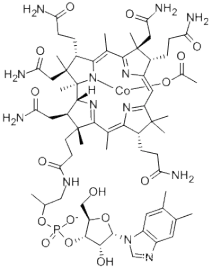 - Cobalamin,acetato- (6CI); Cobinamide, acetate (salt) hydroxide, dihydrogen phosphate(ester), inner salt, 3'-ester with 5,6-dimethyl-1-a-D-ribofuranosyl-1H-benzimidazole; Cobinamide, acetate(salt) hydroxide, dihydrogen phosphate (ester), inner salt, 3'-ester with 5,6-dimethyl-1-a-D-ribofuranosylbenzimidazole(8CI); Cobinamide, acetate phosphate, 3'-ester with 5,6-dimethyl-1-a-D-ribofuranosylbenzimidazole,inner salt (7CI); Acetatocobalamin; Depo-gamma; Fresmin S; Hydroxocobalaminacetate; Hydroxycobalamine acetate; Novidroxin; Twelvmin