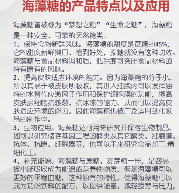海藻糖是一种典型应激代谢物,能够在高温、高寒、高渗透压及干燥失水等恶劣环境条件下在细胞表面形成独特的保护膜,有效的保护生物分子结构不被破坏,从而维持生命体的生命过程和生物特征。