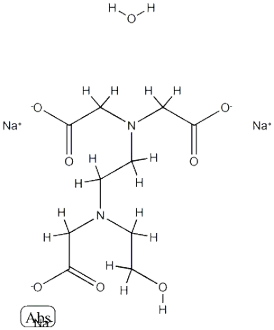 - 羟乙基二胺四乙酸三钠盐(HEDTA三钠);羟乙基二胺三乙酸三钠盐(HEDTA三钠);N-(2-羟乙基)乙二胺三乙酸三钠盐水合物;羟乙基二胺四乙酸三钠盐;N-羟乙基乙二胺三乙酸三钠盐二水合物;N-[2-[双(羧基甲基)氨基]乙基]-N-(2-羟基乙基)甘氨酸三钠盐水合物;N-(2-羟乙基)乙二胺-N,N,N-三乙酸三钠;N-(2-羟乙基)乙二胺三乙酸三钠