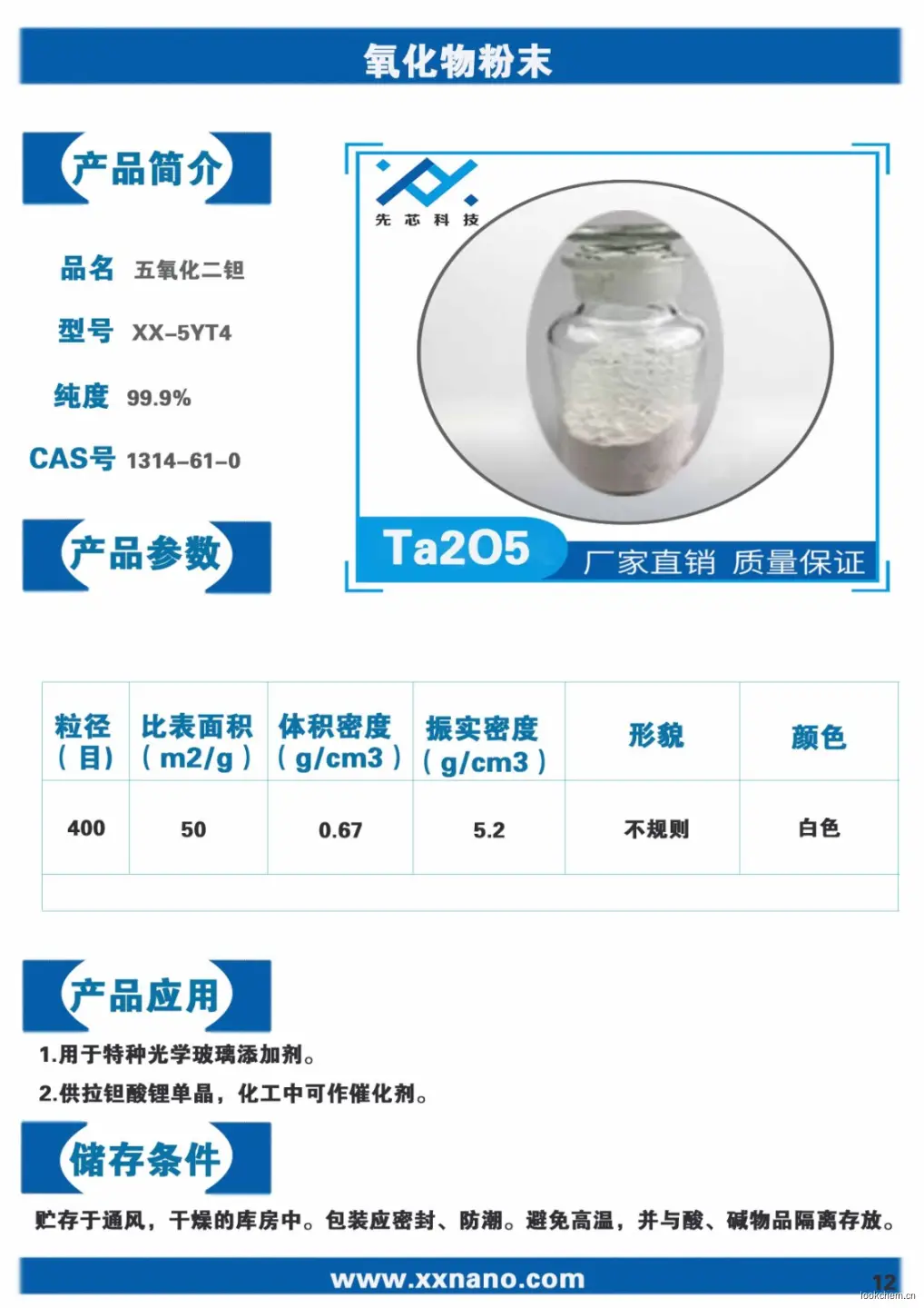 应用方向:生产金属钽的原料。也用于电子工业。供拉钽酸锂单晶和制造高折射低色散特种光学玻璃用,化工中可作催化剂。