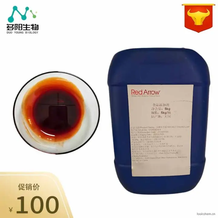 烟熏液是采用硬质果木干山楂果核为基础原料,经高温分解、干馏制成的一种具有天然烟熏风味的香味料。在生产制作工程中不添加加任何化学成分。