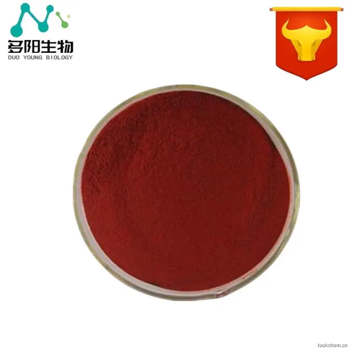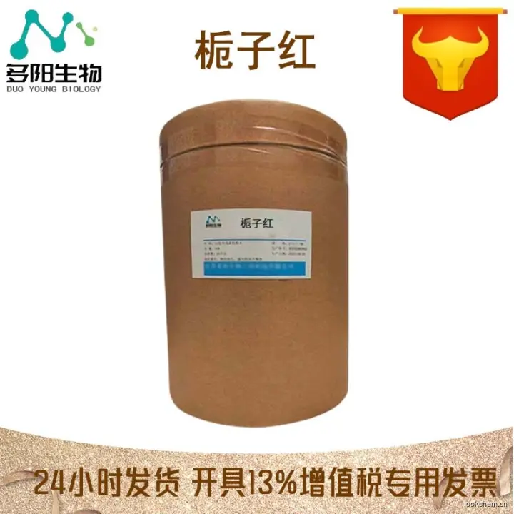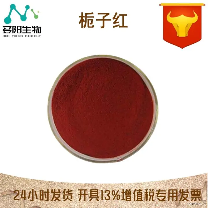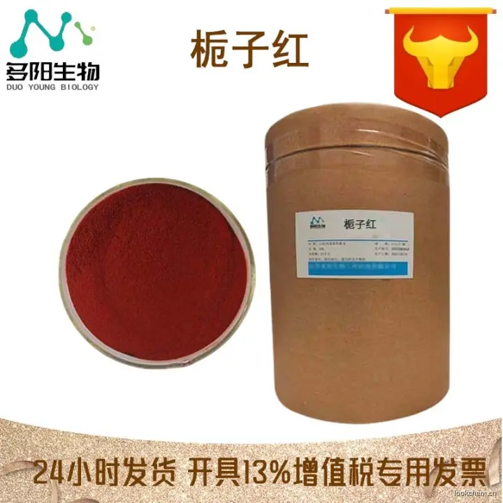 制法:由茜草科植物栀子(Gar denia augastavar. gri fla)果实用温水浸提所得的呈色配糖体的酯类加水分化物,加蛋白质分化物(氨基酸)配成混合物,然后加B -半乳糖苷酶作用后,得天然红色素,再经精制并添加经酶处理过的淀粉,配制成粉末状制品。
