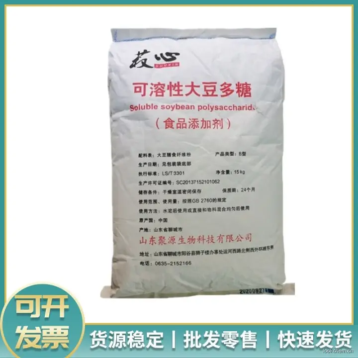 可溶性大豆多糖:源自大豆,将制造分离大豆蛋白或豆腐时得到的豆渣经过酶解、提取、分离、精致、干燥等工艺制成的一种乳化、增稠、披膜剂,同时也是一种水溶性膳食纤维素。