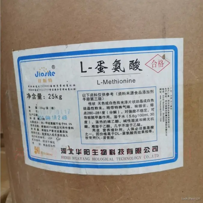 L-蛋氨酸学名甲硫基丁氨酸,是必需的氨基酸之一,白色薄片状结晶或结晶性粉末,有特异的气味,分子量149.21。L-蛋氨酸(左旋体)熔点280~281℃(分解),溶于水和热稀醇,不溶于无水乙醇、苯和丙酮。蛋氨酸是重要的饲料添加剂(营养强化剂)。在食品方面主要与甘氨酸、丙氨酸、缬氨酸、谷氨酸等氨基酸配合做调味剂。在医面,蛋氨酸是氨基酸输液、复合氨基酸制剂的主要组分之2.性状无色或白色有光泽片状结晶或白色结晶性粉末。稍带特殊气味。略有苦味。熔点280~281℃。对强酸不稳定,可导致脱甲基作用。溶于水、温热的稀乙醇、碱性溶液和稀无机盐。难溶于乙醇,几乎不溶于。3.用途例如:防腐剂可以防止由微生物引起的食品变质,延长食品的保存期,同时还具有防止由微生物污染引起的 作用。又如:抗氧化剂则可阻止或推迟食品的氧化变质,以提供食品的稳定性和耐藏性,同时也可防止可能有害的油脂自动氧化物质的形成。此外,还可用来防止食品,特别是水果、蔬菜的酶促褐变与非酶褐变。这些对食品的保藏都是具有一定意义的。CAS:63-68-3CAS No.59-51-8