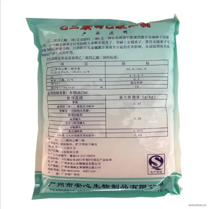 4、能与碱金属以外的绝大多数金属离子生成稳定的络合物,消除金属离子或由其引起的有害作用,水煮食品的水混浊,防止食品氧化变色,从而起到抗氧化、护色、防腐作用,使产品质量稳定。