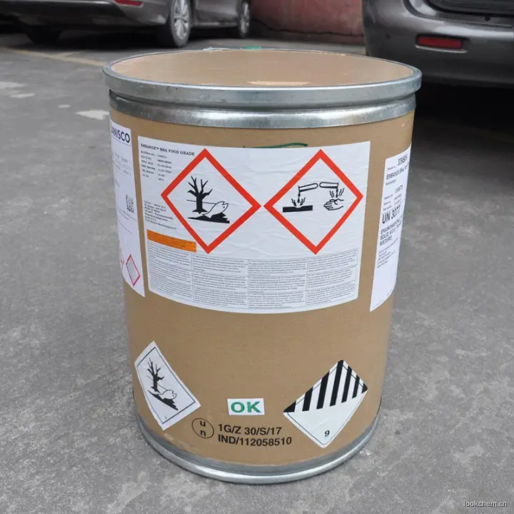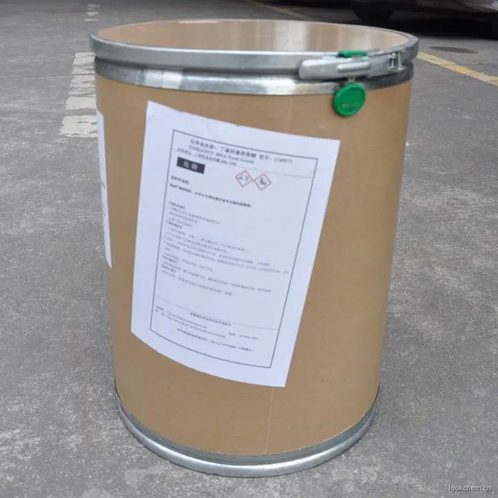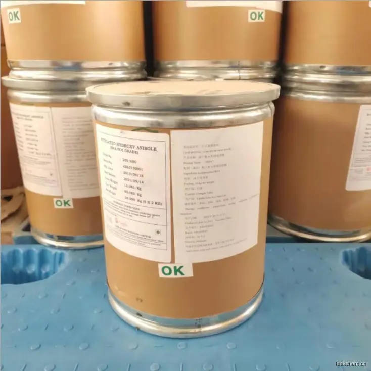 叔丁基对羟基茴香醚(丁基羟基茴香醚 BHA)【含量】:99%【外观】:白色粉末【CAS】:25013-16-5【分子式】:C11H16O2【相对分子质量】:180.25【性状】:白色至微黄色结晶或蜡状固体,略有特殊气味。熔点48~63℃。沸点264~270℃(97709Pa)。不溶于,水。(25g/100mL,25℃)、甘油(1g/100mL,25℃)、猪油(50g/100mL,25℃)、玉米油(30g/100mL,25℃)、花生油(40g/100mL25℃)和丙二醇(50g/100mL,25℃0)。【用途】:抗氧化剂。可用于油脂、油脂食品、干鱼制品、饼干、方便面、速煮面、果仁罐头、腌渍肉制品,早餐谷类食品、糖果用香精。BHA是一种很好的抗氧剂,在有效浓度时没有毒性。作食品抗氧剂,能阻碍油脂食品的氧化作用,延缓食品开始败坏的时间。其在食品中的用量以脂肪计不得超过0.2g/kg。其用量为0.02%时比0.01%的抗氧效果提高10%,当用量超过0.02%时抗氧化效果反而下降。作化妆品的抗氧化剂时,能对酸类、氢醌、甲硫氨基酸、卵磷脂及硫化二丙酸等起抗氧化作用。亦可作饲料的抗氧剂。