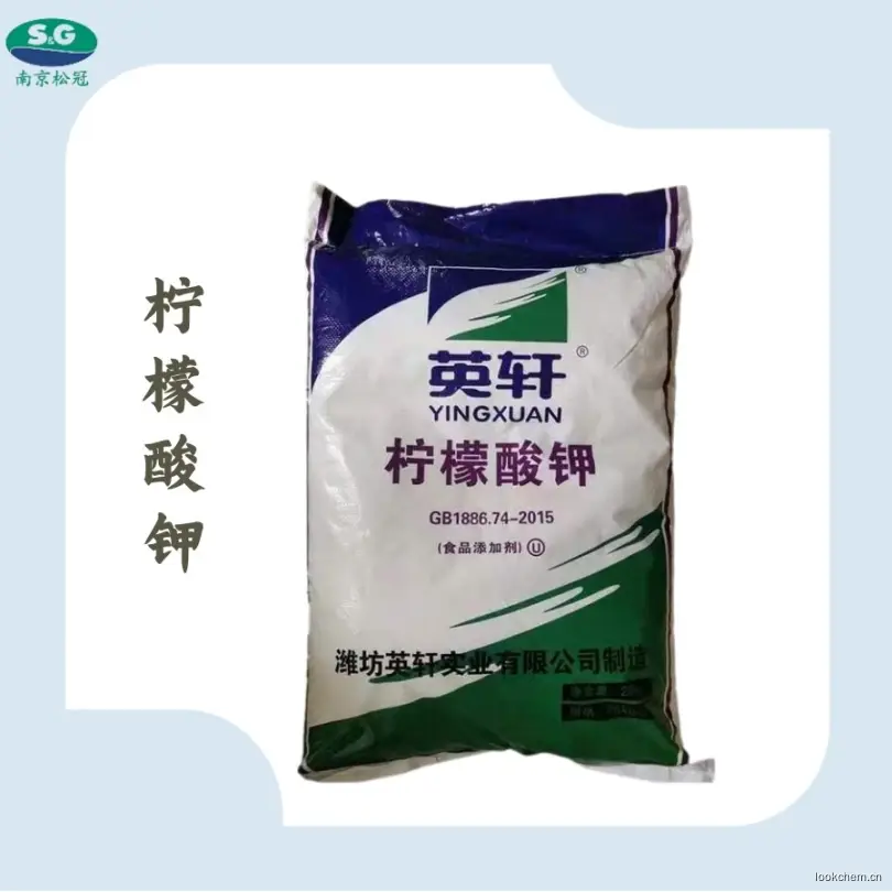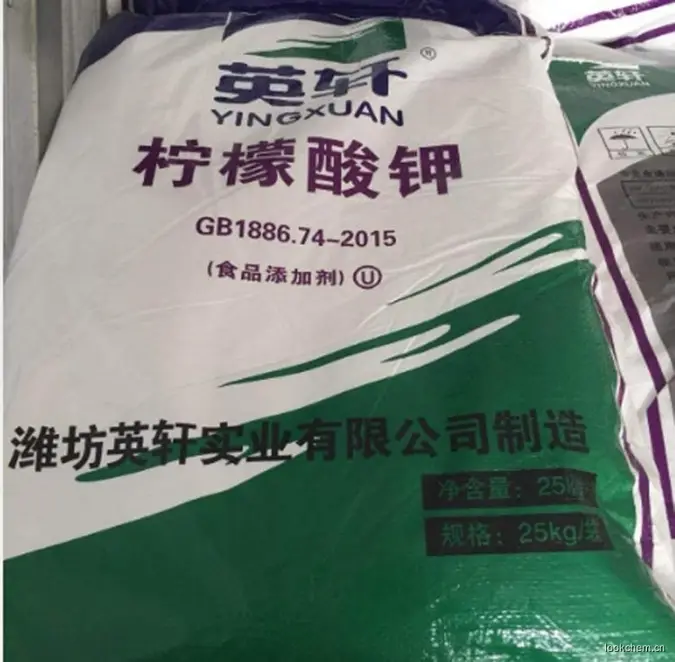 柠檬酸钾 别名:柠檬酸三钾 枸橼酸钾分子式:K3C6H5O7·H2O2、 分子量:324.413、 特性:白色或微黄色结晶颗粒或结晶性粉末,无臭、味咸,凉、微有潮解性,在水或甘油中易溶,在乙醇中几乎不溶。相对密度1.98。加热至230℃熔化并分解。1、 用途:在食品工业中作缓冲剂、螯合剂、稳定剂、抗氧化剂、乳化剂、调味剂等。可用于乳及乳制品、果冻、果酱、肉类、罐装水凝胶点心,亦用于干酪的乳化、柑橘的保鲜等。2、 包装:内衬聚乙烯塑料袋,外套复合塑料编织袋,每袋净重25kg。3、贮存与运输注意事项:本品应密封贮存于干燥通风的仓库中,防止受潮、受热,与有害有毒物品分开存放,