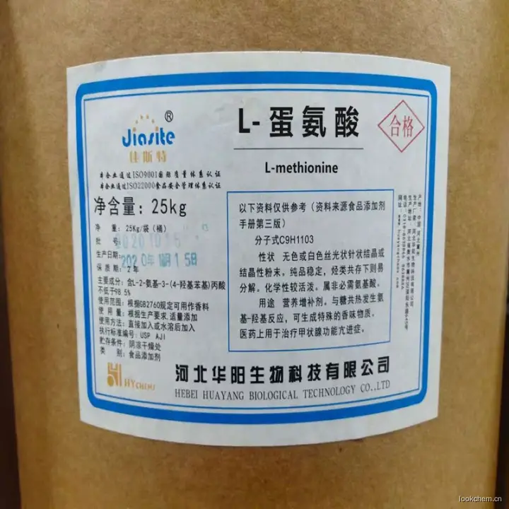 L-蛋氨酸学名甲硫基丁氨酸,是必需的氨基酸之一,白色薄片状结晶或结晶性粉末,有特异的气味,分子量149.21。L-蛋氨酸(左旋体)熔点280~281℃(分解),溶于水和热稀醇,不溶于无水乙醇、苯和丙酮。蛋氨酸是重要的饲料添加剂(营养强化剂)。在食品方面主要与甘氨酸、丙氨酸、缬氨酸、谷氨酸等氨基酸配合做调味剂。在医面,蛋氨酸是氨基酸输液、复合氨基酸制剂的主要组分之2.性状无色或白色有光泽片状结晶或白色结晶性粉末。稍带特殊气味。略有苦味。熔点280~281℃。对强酸不稳定,可导致脱甲基作用。溶于水、温热的稀乙醇、碱性溶液和稀无机盐。难溶于乙醇,几乎不溶于。3.用途例如:防腐剂可以防止由微生物引起的食品变质,延长食品的保存期,同时还具有防止由微生物污染引起的 作用。又如:抗氧化剂则可阻止或推迟食品的氧化变质,以提供食品的稳定性和耐藏性,同时也可防止可能有害的油脂自动氧化物质的形成。此外,还可用来防止食品,特别是水果、蔬菜的酶促褐变与非酶褐变。这些对食品的保藏都是具有一定意义的。CAS:63-68-3CAS No.59-51-8