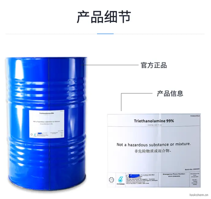 在化妆品(包括皮肤洗涤、眼胶、保湿、洗发剂等)中用作乳化剂、保湿剂、增湿剂、增稠剂、PH平衡剂。在化妆品配方中用于与脂肪酸中和成皂,与硫酸化脂肪酸中和成胺盐。三乙醇胺是乳膏制剂中常用乳化剂,用三乙醇胺乳化的乳膏产品具有膏体细腻,膏体亮白的特点,另三乙醇胺与高级脂肪酸或高级脂肪醇形成的胶体相稳定性好,产品质量稳定,可容外加成分比重高。三乙醇胺是含有卡波姆等酸性高分子凝胶的最常用中和剂,三乙醇胺通过与卡波姆的羧基中和,形成稳定的高分子结构,达到增稠和保湿的应用效果。