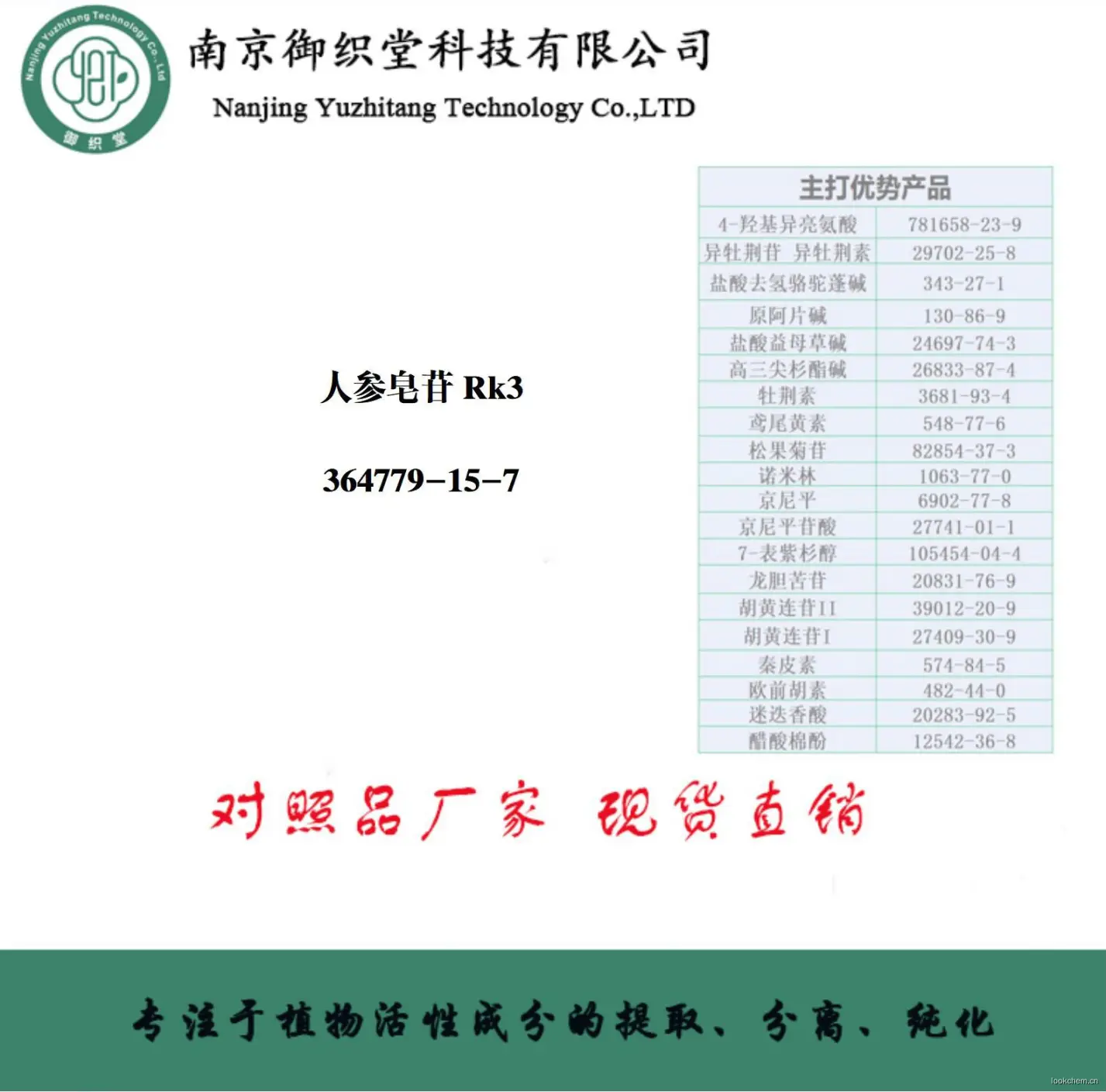 南京御织堂科技有限公司专注于天然产物活性成分的提取、分离、纯化,是一家集研发、生产、销售为一体的生产型企业。深耕于标准品、植物提取物、生物技术、试剂以及相关产品的研发与销售,旨在为生命科学领域提供配套的技术与产品,推动生命科学领域的发展。长期与各类高校、医院、科研单位进行合作,各类产品依据相关技术标准进行标定,提供准确的含量值和核磁结构,以确保分析结果的准确性。公司生产线配备浓缩、分离、透析、烘干等全套设备,根据客户的需求进行生产加工,承接相关科研项目。欢迎下单咨询,建立长期的合作关系。