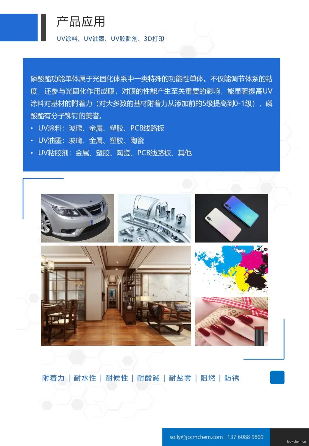 广州谨诚化工技术有限公司是集研发、生产、销售及服务于一体的化工企业。公司自主研发产品涉及光学材料、电子材料、高分子功能材料,产品可广泛应用于胶粘剂、表面涂装、油墨、化妆品、牙科材料等。在紫外光固化原材料领域具有核心竞争力。